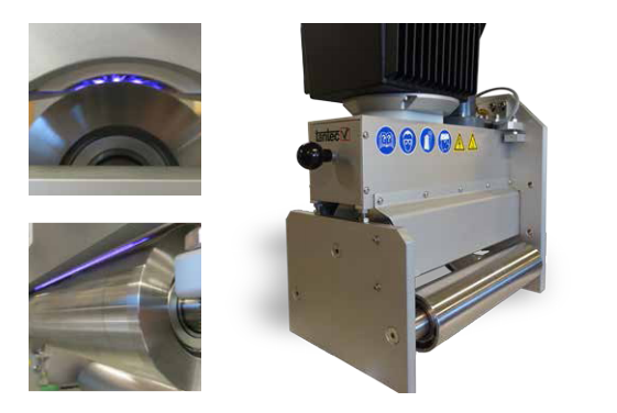 由于聚合物材料的表面能很低,造成了在后道印刷或膠水粘結出現油墨脫落和粘結效果不理想的問題。為了獲得最佳的粘結效果,提升材料表面能變成至關重要的環節。通過Tantec的電暈設備處理可以顯著提高其材料表面能,改善粘合特性。